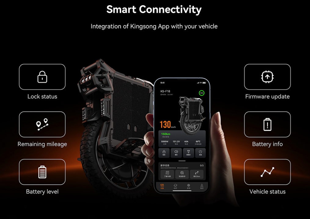 Im Vergleich zu anderen Modellen der Marke KingSong nimmt der F18 die absolute Spitzenposition ein. Gegenüber kompakteren Modellen wie dem KS-16S oder KS-18XL bietet er ein Vielfaches an Leistung (5000 W gegenüber 2000–2200 W), eine deutlich höhere Höchstgeschwindigkeit sowie eine wesentlich bessere Federung – insbesondere dank des 4-Punkt-Systems mit 100 mm Federweg. Im Vergleich zur S-Serie, die eher für urbane Mobilität ausgelegt ist, bietet der F18 extreme Leistung, eine höhere Traglast von 140 kg, einen Akku mit bis zu 2664 Wh sowie eine Reichweite von rund 150 km und zählt damit zu den Touring- und Performance-Einrädern. Dank der modularen Konstruktion ist auch die Wartung deutlich einfacher als bei älteren Modellen. Der KingSong F18 ist schlicht das Flaggschiff der Marke – eine Kombination aus hoher Geschwindigkeit, extremer Leistung, sicherem Fahrverhalten und maximaler Robustheit.
