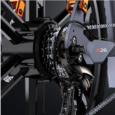 Das Herzstück des ENGWE X26 ist ein bürstenloser Motor mit 1000 W Leistung und einem Peak-Output von 1200 W, der ein Drehmoment von ca. 70 N·m bietet. Diese Leistung ermöglicht einen schnellen Start und sanfte Beschleunigung selbst in hügeligem Gelände. Die Höchstgeschwindigkeit beträgt bis zu 50 km/h (in Modi außerhalb der EU-Limite). Der Akku 48 V / 19,2 Ah (optional 29,2 Ah) ermöglicht eine Reichweite von bis zu 150 km im PAS-Modus, was in dieser Kategorie außergewöhnlich ist. Das Aufladen dauert etwa 8 Stunden, und der Akku ist herausnehmbar, sodass er zuhause oder im Büro geladen werden kann. Der Fahrer kann zwischen mehreren Unterstützungsstufen wählen – vom Eco-Modus bis zum Sportmodus mit voller Motorleistung. Die 26×4.0″-Reifen und die dreifache Federung garantieren optimale Kraftübertragung, Stabilität und Komfort. Der ENGWE X26 bietet somit eine perfekte Balance zwischen Leistung, Ausdauer und Fahrkomfort und zählt zu den besten E-Bikes seiner Klasse.
