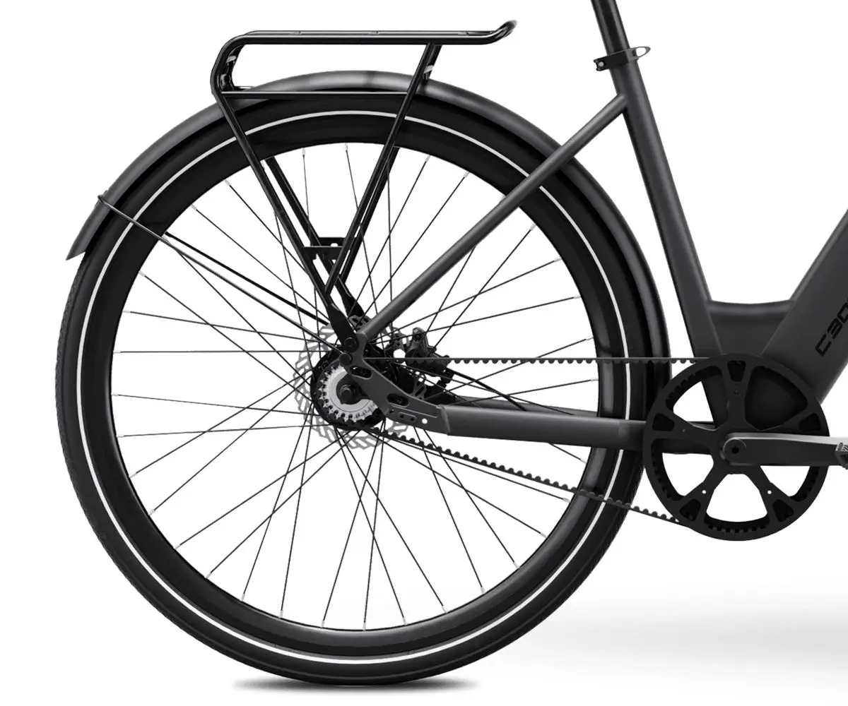 Das MS ENERGY C300 2025 besticht auf den ersten Blick durch seinen eleganten Rahmen aus leichtem, aber robustem Aluminium in stilvollem Carbon Black. Der Rahmen verfügt über eine interne Kabelführung, die die Ästhetik verbessert und die Elektroinstallation schützt. Der integrierte Akku ist optisch harmonisch im Rahmen eingebaut und gleichzeitig herausnehmbar für einfaches Laden. Ausgestattet mit Schutzblechen vorne und hinten, Gepäckträger über dem Hinterrad und ergonomischen Griffen für komfortables Fahren auch auf längeren Strecken. Die gefederte Vorderradgabel erhöht den Fahrkomfort auf unebenen Stadtstraßen. Der moderne Gates Carbon Drive Riemenantrieb sorgt für leisen, wartungsfreien Betrieb und ist wetterbeständig. Die Reifen mit 27,5″ (28″ × 1,65″) sind pannensicher, was ungewollte Stopps minimiert. Integriertes LED-Licht mit 40 Lux und Reflektoren erhöhen die Sichtbarkeit im Verkehr, alle Komponenten sind für den täglichen Stadtgebrauch ausgelegt.