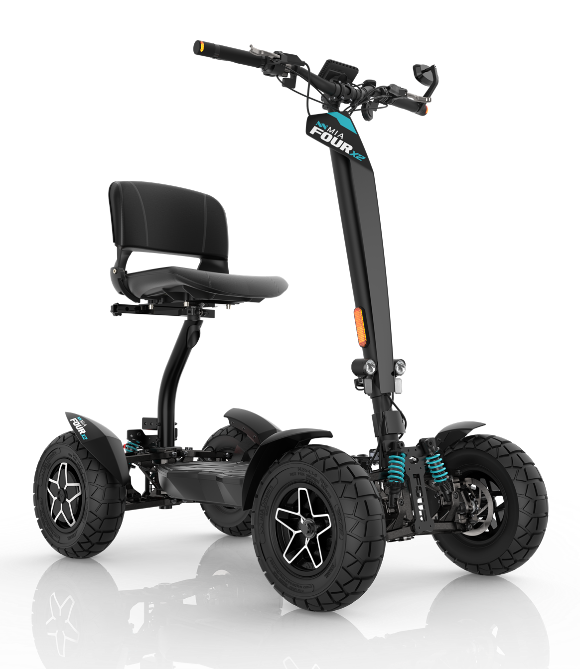 Der leistungsstarke Elektroroller MIA FOUR X2 mit 4x2-Antrieb, einer Leistung von bis zu 7.200 W, einer Reichweite von 100 km und maximaler Stabilität dank vier Rädern.