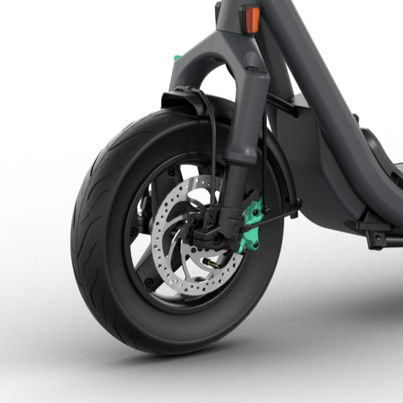Die Sicherheit beim Egret GT ist auf einem extrem hohen Niveau. Für maximale Kontrolle sorgen hydraulische Scheibenbremsen mit 160-mm-Scheiben, die ein stabiles, präzises und sofortiges Bremsen ermöglichen. Die 13"-Reifen gewährleisten hervorragenden Grip und einen kürzeren Bremsweg. Die Beleuchtung ist professionell gelöst – OSRAM LED-Licht mit 80 Lux, ein hinteres LED-Licht mit Bremsfunktion sowie integrierte Blinker erhöhen die Sichtbarkeit bei Nacht und schlechtem Wetter deutlich. Der Rahmen ist so konstruiert, dass er eine Last von 150 kg ohne Stabilitätsverlust trägt. Die elektronische Sicherheit wird durch NFC-Entriegelung, Alarm und Wegfahrsperre gewährleistet, die den Scooter bei jedem Abstellen schützen. Die Funktion Apple Find My ermöglicht eine permanente Standortverfolgung, was das Diebstahlrisiko erheblich verringert. Die Wasserfestigkeit IPX5 erlaubt Fahrten im Regen, während der Akku mit IPX7-Zertifizierung sogar ein kurzes Eintauchen in Wasser aushält. Dank des Drehmoments von 62 Nm ist die Beschleunigung auch unter anspruchsvollen Bedingungen sofortig und sicher.