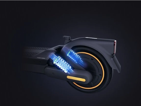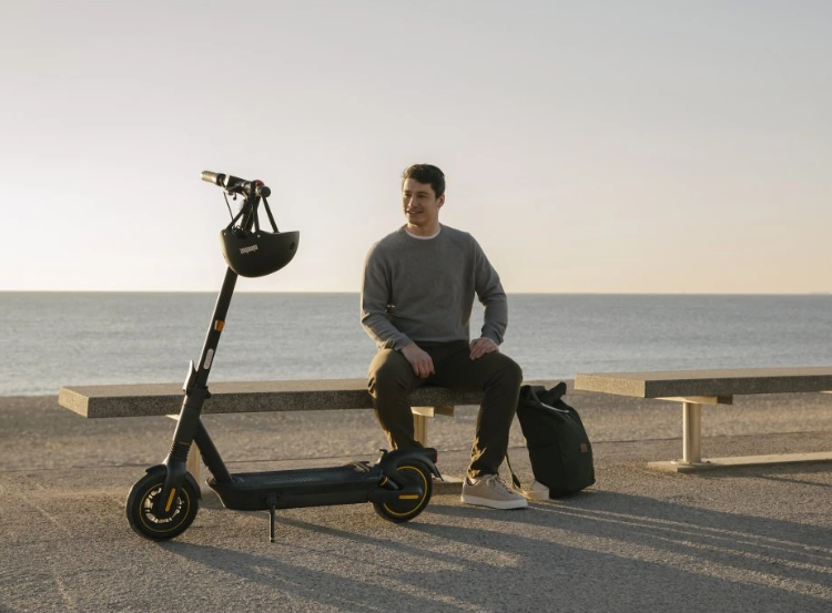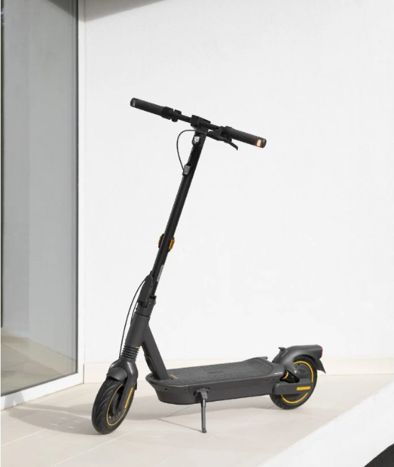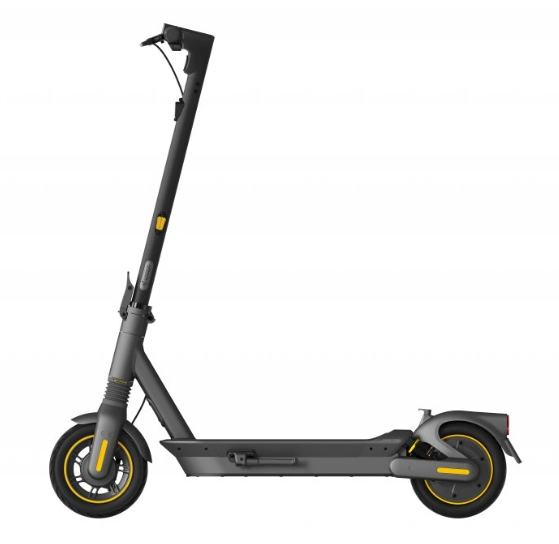 Premium-E-Scooter Ninebot MAX G2 E mit einer Reichweite von bis zu 70 km, 450/900 W Leistung, 10"-selbstreparierenden Reifen, hydraulischer Federung, Blinkern, TCS-System und einer Tragfähigkeit von 120 kg.
