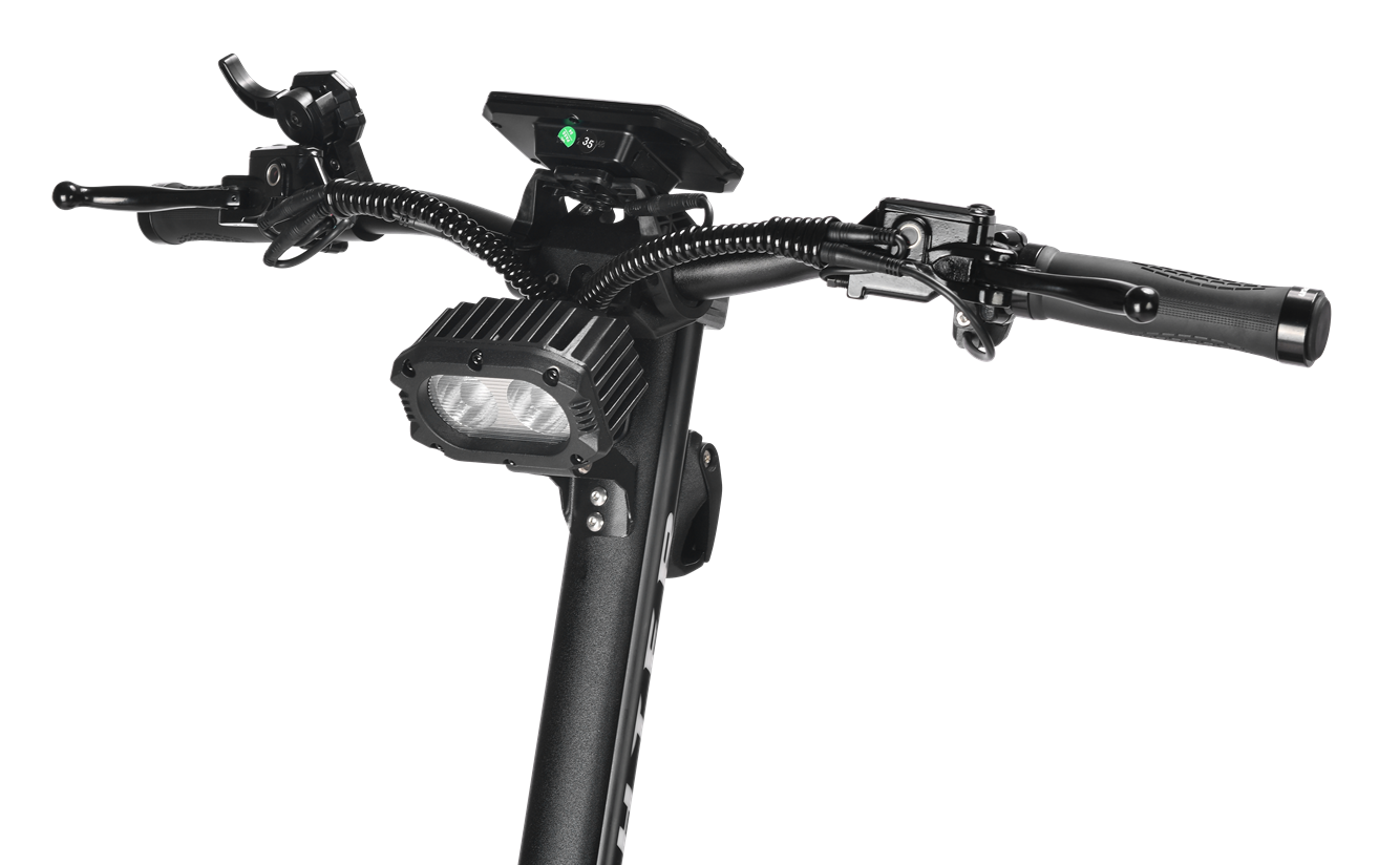 Das Design des Teverun Fighter Eleven Plus ist klar auf Funktionalität, Langlebigkeit und ein modernes Premium-Erscheinungsbild ausgerichtet. Der robuste Rahmen wurde so konzipiert, dass er hohe Belastungen, aggressive Fahrweise und anspruchsvolles Gelände problemlos bewältigt, dabei jedoch technisch klar und hochwertig wirkt. Die hohe Verarbeitungsqualität ist in jedem Detail spürbar – von der verstärkten Konstruktion bis hin zur präzisen Anordnung der Komponenten. Der Roller misst im ausgeklappten Zustand etwa 135 × 65 × 128 cm, zusammengeklappt reduziert sich das Maß auf kompakte 135 × 24 × 58 cm, was Lagerung und Transport deutlich erleichtert. Zur Ausstattung gehören vollhydraulische 4-Kolben-Scheibenbremsen, die selbst bei hohen Geschwindigkeiten eine sofortige und präzise Bremswirkung gewährleisten. Der Fahrkomfort wird durch das einstellbare hydraulische KKE-Fahrwerk erhöht, das Unebenheiten effektiv absorbiert und individuell an Gewicht und Fahrstil des Fahrers angepasst werden kann. Große 11-Zoll-CST-Tubeless-Reifen sorgen für hervorragende Traktion, Stabilität und hohe Pannensicherheit. Zu den wichtigsten Vorteilen zählt auch die umfangreiche elektronische Ausstattung: TFT-Farbdisplay, NFC-Schloss, Bluetooth-Konnektivität, App-Anbindung, RGB-Ambientebeleuchtung, leistungsstarke LED-Front- und Rückleuchten sowie ein integrierter Steering Damper, der die Lenkstabilität bei hohen Geschwindigkeiten deutlich erhöht. Zusätzlich verfügt der Roller über eine IP-Schutzklasse IPx5 – IPx6, wodurch auch Fahrten bei ungünstigen Wetterbedingungen möglich sind.